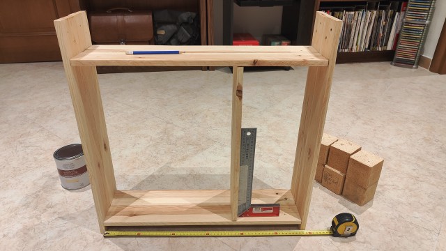 Ho poi forato, alla giusta altezza, le tavole dei montanti laterali, con punta da 5mm per lasciar passare senza troppi problemi le viti da legno. Accostando queste alle tavole orizzontali ho potuto poi segnare sui lati i punti in cui fare piccoli fori per agevolare l’ingresso delle viti nel legno. Al termine ho così montato del tutto la struttura esterna. Per sicurezza per ogni giunzione ho qui usato quattro viti, visto che sono i giunti che tengono tutto il resto del mobile assieme. Un eccesso di zelo forse, ma il risutato mi piace.